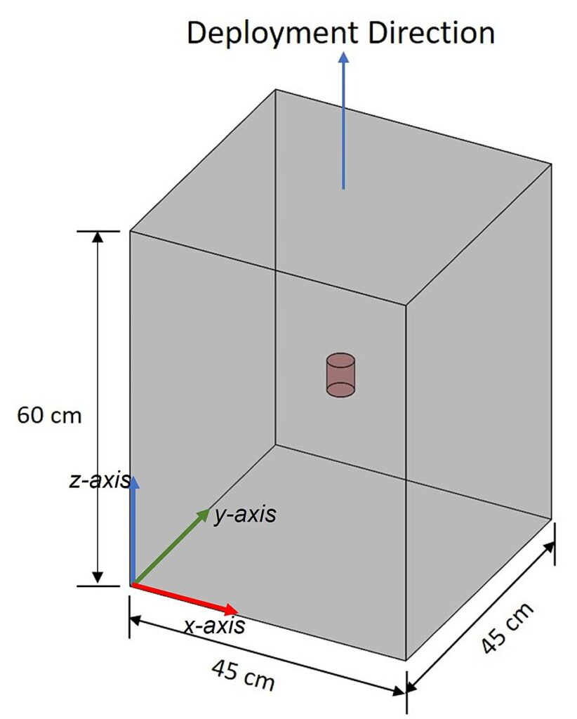 [[File:3D LaunchU dim.jpg|alt=This image shows a rectangular prism with a 3-axis origin located at the bottom left. The rectangular prism has dimensions 45 cm by 45 cm on the x-y plane and the height along the z-axis is 60 cm. The deployment direction is indicated as being along the z-axis. |thumb|LaunchU Volume and Deployment Direction]]