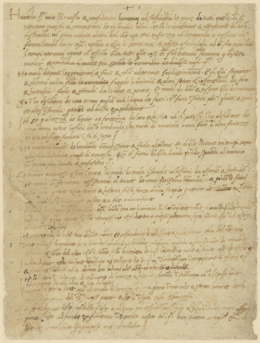 In the letter, preserved in the Codex Atlanticus at the Biblioteca Ambrosiana, Leonardo initially presents himself as a military engineer, emphasizing his ability to design war machines, siege engines, and innovative defensive systems capable of ensuring security and strategic superiority in battle.[2] Only towards the end of the letter does Leonardo mention his civil and artistic skills, highlighting his ability to execute works of architecture, sculpture, and painting.[1][2]