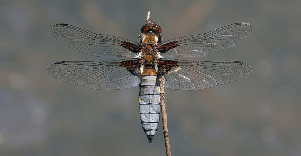 Libellula depressa, the broad-bodied chaser or broad-bodied darter,[2] is one of the most common dragonflies in Europe and central Asia. It is very distinctive with a very broad flattened abdomen, four wing patches and, in the male, the abdomen becomes pruinose blue.