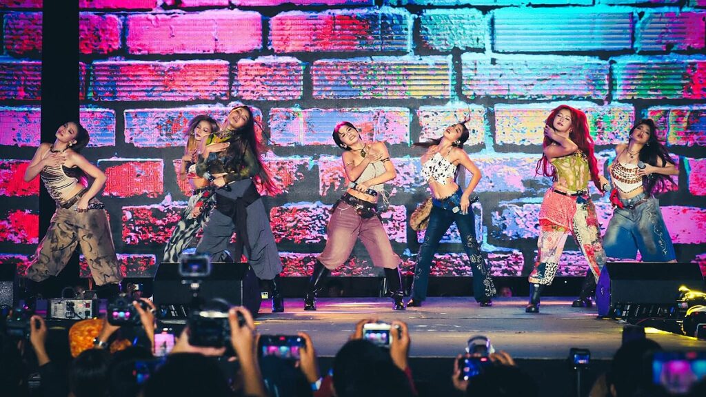 Members of Bini dancing in vibrant scene in eclectic outfits performing on a lit stage with a colorful brick wall backdrop