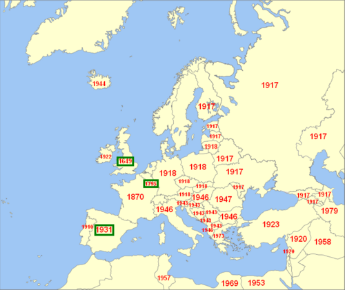Dates of the latest abolitions of monarchies in Europe and the territories nearby. A green rectangle indicates that the monarchy was restored afterwards and is currently functioning. If a country has no date, it means that either it has never had a monarchical government (e.g. Switzerland) or it has been functioning throughout the country’s modern history (e.g. Sweden, Denmark and Norway). Note that the dates do not necessarily mark the end of the national independent monarchy but the territory it covered (e.g. Ukraine).