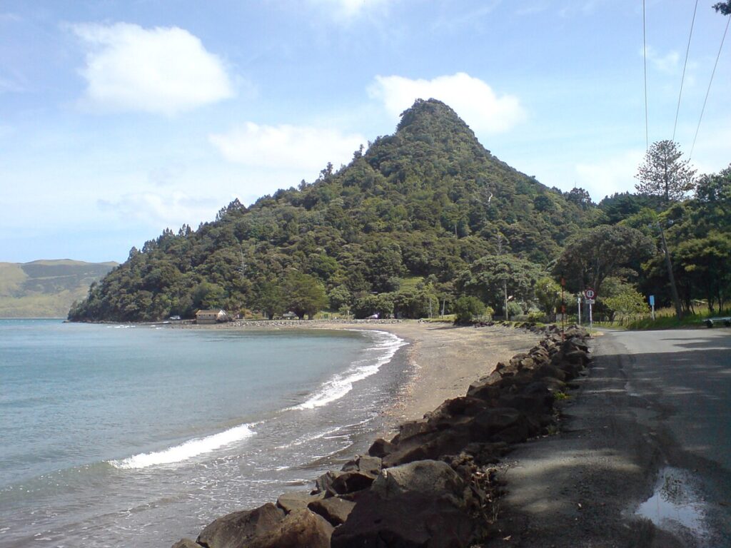 The settlement is in the traditional rohe of Te Kawerau ā Maki, close to the location of Te Komoki, one of the few West Auckland pā to have defensive ditches. Te Komoki pā site is located at Te Kā-a-Maki / Jackie Hill, a 148-metre hill to the south of Little Huia.[7] The pā has 12 terrances and five pits, protected by cliff faces on three sides and a ditch on the fourth. Te Komoki is one of the best preserved pā of the Waitākere Ranges. The name for the hill, Te Kā-a-Maki (“The Fires of Maki”), refers to Maki, the eponymous ancestor of Te Kawerau ā Maki.[7]