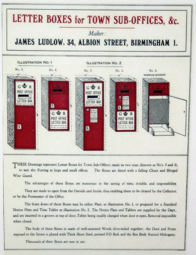 Ludlow boxes were introduced because, until 1910, sub-postmasters were responsible for the provision of secure posting facilities in their post offices. As the traditional cast iron boxes were heavy and expensive, James Ludlow & Son introduced a range of much cheaper boxes which they could supply at a competitive price to sub-postmasters. They were also to be seen in large country houses, public buildings and hotels.