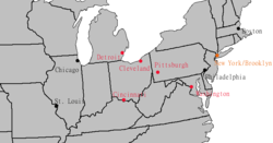 Cities that hosted MLB teams from 1903 to 1953; cities that hosted one team are in red, cities that hosted two teams are in black. New York/Brooklyn, with three teams, is in orange. No major league baseball teams moved or were added between 1903 and 1953.