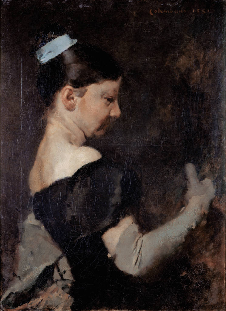 Thanks to her close relationship with her brother, Columbano, who created several portraits of her, she accompanied him on a study trip to Paris in 1881 and became a member of the Portuguese art association Grupo do Leão (Lion’s Group) in 1885.[2] As a painter, she specialized in watercolours of flowers, especially chrysanthemums and roses, and frequently participated in exhibitions at the Sociedade Promotora de Belas-Artes. She was also a keen craftswomen, decorating earthenware and, in particular, working with lace.[2][1]