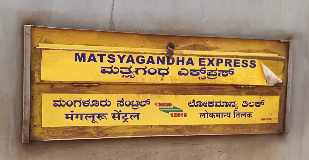 The Matsyagandha Express was named by Mr. Ramchandra Sawalekar, a gazetted officer in the Indian Navy. Matsyagandha literally means “Fragnance of Fish” – the appellation was given since the train runs along the fishing coast of Western India adjoining the Arabian Sea–Konkan Railway route. The name is based on a character from the epic Mahabharata, Satyavati who was dubbed the moniker of Matsyagandha due to the fragrance of fish that emanated from her. Matsyagandha is also a famous Marathi musical play written by Vasant Kanetkar.[5] The train has become important link and emotional chord for natives of Dakshina Kannada, Udupi and Uttara Kannada districts living in Mumbai and surrounding cities.