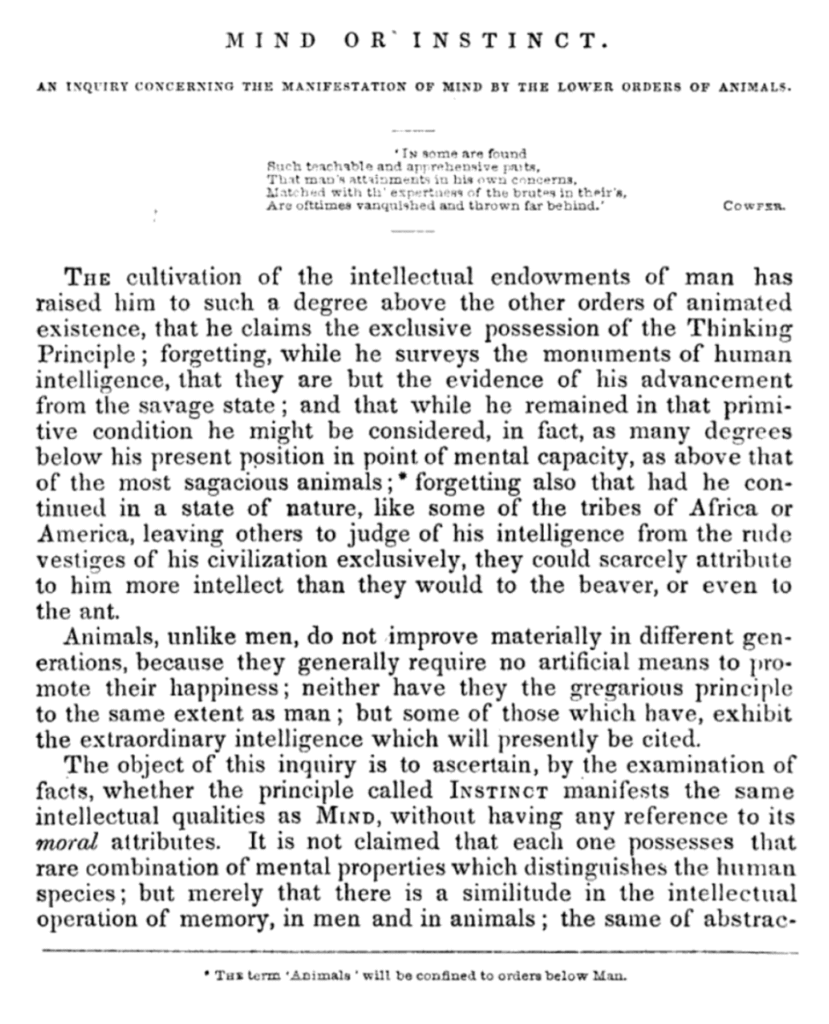 “Mind or Instinct: An Inquiry Concerning the Manifestation of Mind by the Lower Orders of Animals” is an 1843 essay by American anthropologist Lewis H. Morgan that argues animals and humans share the same intellectual principle, differing only in degree. Written when Morgan was 25 and recently admitted to the New York bar, it drew on his rural upbringing, classical studies, and interest in natural history. Published under the pseudonym “Aquarius” in The Knickerbocker, the essay addresses issues in comparative psychology and the philosophy of mind, challenging the prevailing view that animal behavior is guided by instinct alone. Morgan discusses animal memory, abstraction, imagination, and reasoning, drawing on examples from natural history, anecdotal reports, and classical authorities, and concludes that continuity of mind across species has moral implications for the treatment of animals.