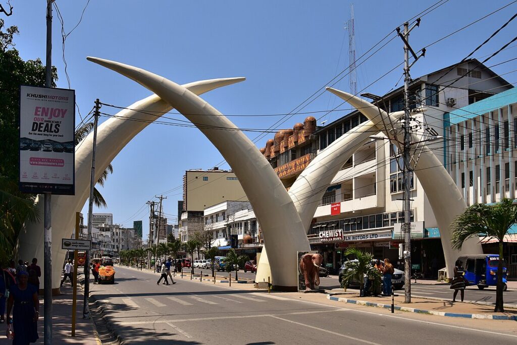 The Mombasa Tusks, also referred to as Mapembe ya Ndovu or Mapembeni[1] or Pembe za Ndovu (Swahili for elephant tusks),[2] form a monument over Moi Avenue, a major thoroughfare in Mombasa, Kenya. Built in the 1950s to commemorate visits by the British royal family, the monument originally comprised two wooden structures resembling tusks; nowadays, there are four aluminium tusks in an M shape. The monument is under the jurisdiction of the National Museums of Kenya in addition to the city’s municipal government.