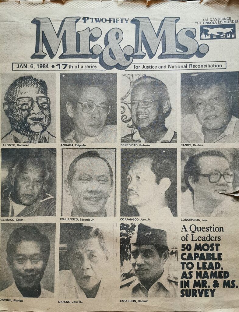 Mr. & Ms. Special Edition was created by publisher Eugenia Apostol in response to the murder of opposition leader Benigno “Ninoy” Aquino upon his return from exile in the United States. National dailies were so intimidated by Marcos that coverage of the murder and Aquino’s funeral, attended by two million Filipinos, was negligible. Apostol, angered by the non-coverage, printed a newsprint edition of Mr. & Ms. the glossy variety magazine she published[1][2] which reproduced reportage and comment from the international press.
