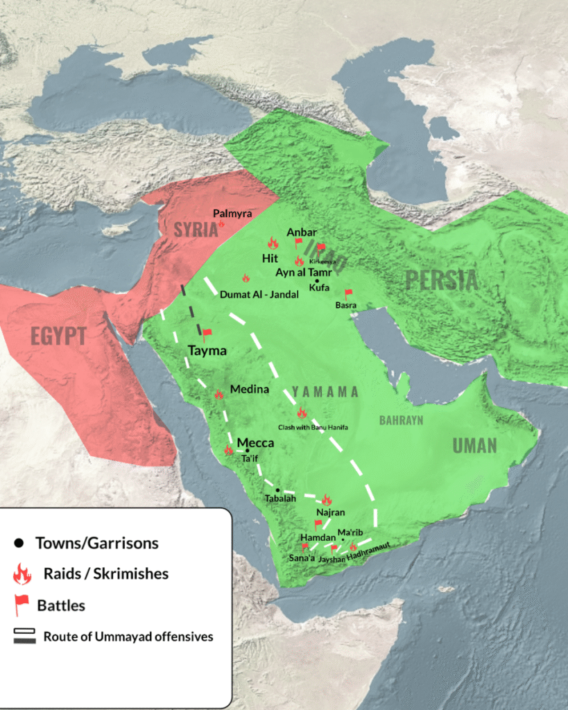 Busr entered Al-Yamama and decided to punish the chieftain of the Hanifa for his neutrality in the civil war, however spared his tribesmen but killed Mujja’a ibn Murara who was the chieftain and took captive his son who was later freed by Mu’awiya and made the chief of the Hanifa tribe.[49]
