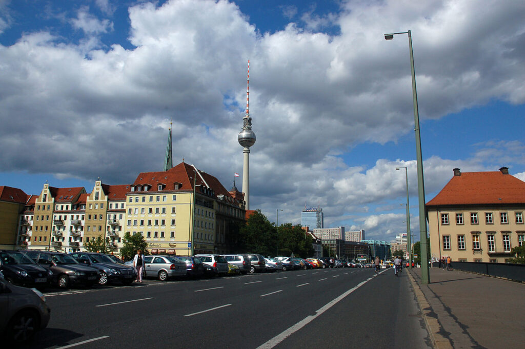 Mühlendamm (Mill Dam) is a major thoroughfare in the central Mitte district of Berlin, Germany. It runs from the historic Cölln and Fischerinsel quarters to the Molkenmarkt square of Alt-Berlin via the Mühlendammbrücke (Mill Dam Bridge) crossing the Spree river. Named after several watermills at the site, a historic causeway was first laid out at this location about 1200 and became the nucleus of the late medieval city foundation. The current prestressed concrete bridge was built in 1968. It is part of an east–west road link to Berlin’s city centre and the Bundesstraße 1 highway.