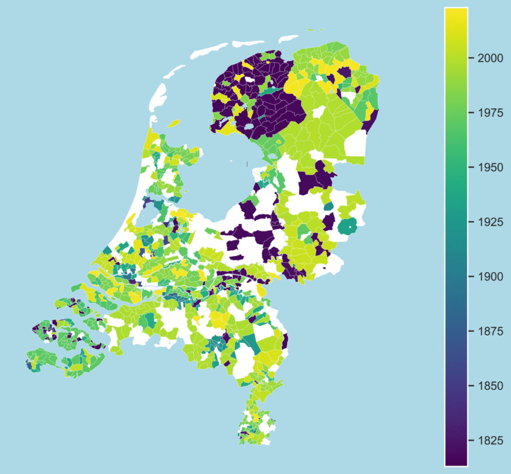 Map of Dutch municipalities in 1812, coloured on the basis of the year of abolishment.