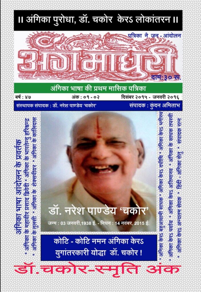 Dr. Naresh Pandey ‘Chakor’ (3 January 1938 – 14 November 2015) was a pre-eminent Indian litterateur, editor, poet, and cultural activist from Bihar, renowned as a foundational figure and an “epoch-making warrior” (युगांतरकारी योद्धा) of the Angika language and its literary movement. His most enduring contribution was the continuous publication and editing of the Angika monthly magazine ‘Ang Madhuri’ for 46 years.[1]
