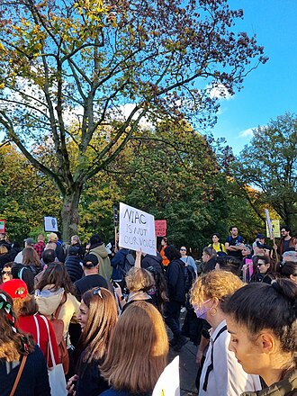 A placard in a Iran solidarity protests in Berlin on 22 October 2022 has written “NIAC IS NOT OUR VOICE” on it.