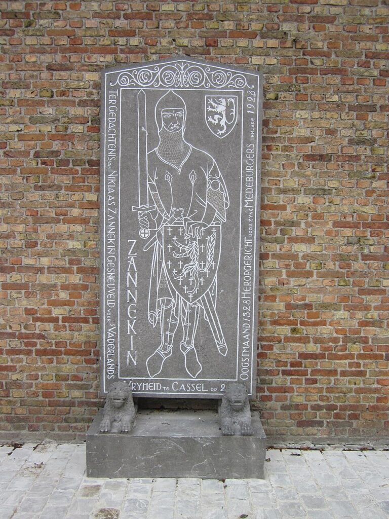 Nicolaas Zannekin was a rich farmer from [[Lampernisse]]. During the early 14th century, Zannekin served as leader of the revolt in coastal Flanders against the oppressive tax policy of the [[Count of Flanders]], [[Louis I of Flanders|Louis of Nevers]]. Zannekin and his men captured the towns of [[Nieuwpoort, Belgium|Nieuwpoort]], [[Veurne]], [[Ypres]] and [[Kortrijk]]. In Kortrijk, Zannekin was able to capture the Count himself. In 1325 attempts to capture [[Ghent]] and [[Oudenaarde]] failed. The [[List of French monarchs|King of France]], [[Charles IV of France|Charles IV]], intervened, whereupon Louis was released from captivity in February 1326 and the ”Peace of Arques” was sealed. In 1328 hostilities again erupted, causing the count to flee for France. Louis was able to convince the new king of France, [[Philip VI of France]], to come to his aid, and Zannekin and his followers were decisively defeated by the royal French army in the [[Battle of Cassel (1328)]], where Zannekin himself was killed.