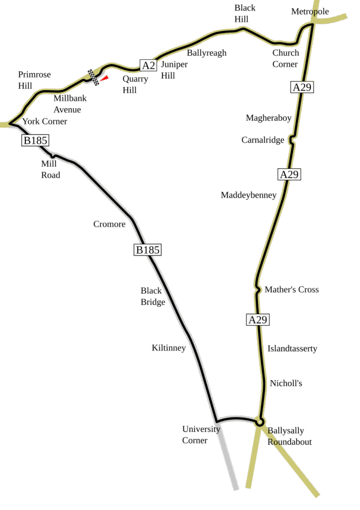 1973 saw the first major changes to the course, which include the exclusion of the Promenade at Portstewart from the route and the moving of the start/finish line to its current location between Juniper Hill and Millbank Avenue. These changes meant the route used Station Road (B185) for the first time and saw the introduction of York Corner. Shell Hill Bridge, an iconic part of the original course was used for the last time in 1979. In 1980, a new link road, from University Corner to Ballysally Roundabout, was introduced. A chicane was introduced just before the approach to the Juniper Hill corner in 1983 and in 1988 improvements were made to Mather’s Cross and the start/finish chicane was introduced to reduce the speeds around Primrose Hill as well as allowing safer access to the pitlane.