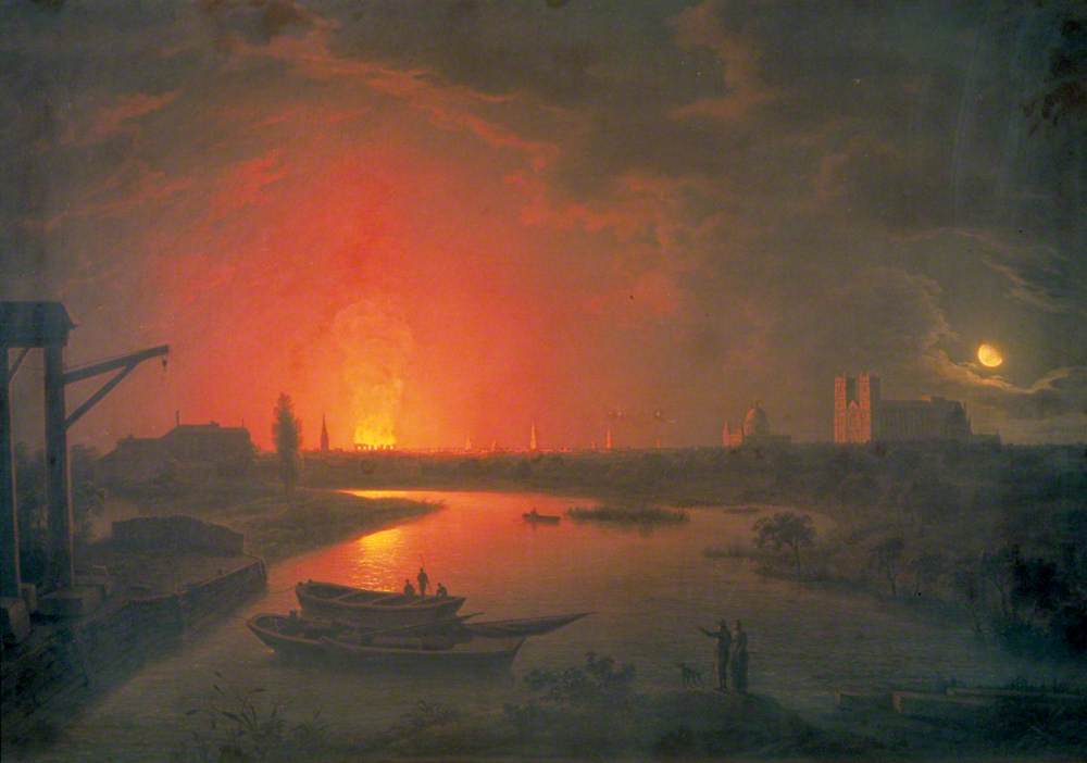 Old Drury Lane Theatre on Fire is an 1809 oil painting by the British artist Abraham Pether. It depicts a panoramic view of London on the night of 24 February 1809, the night that the Theatre Royal, Drury Lane burned down during a major fire. It portrays the scene from a bridge over the River Thames looking eastwards with the skyline illuminated by the blaze. [1] The playwright and politician Richard Brinsley Sheridan who owned the theatre, reportedly watched it burn while drinking and quipped “a man may surely be allowed to take a glass of wine by his own fireside“. The Times suggested it was the most major such event since the Great Fire of London. [2]