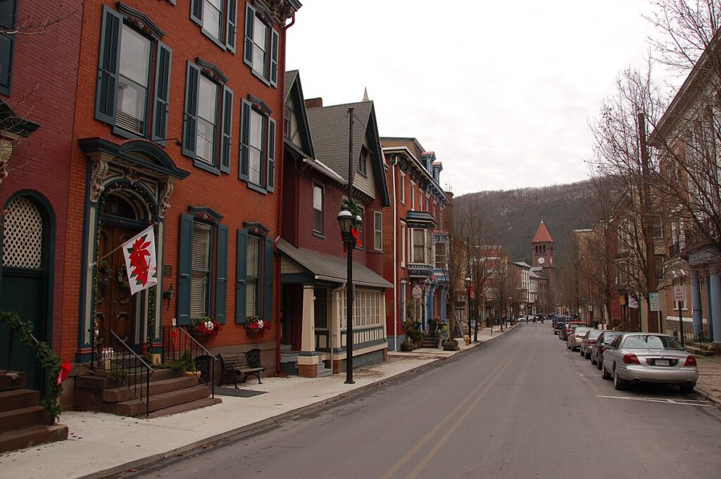 The district includes 28 contributing buildings in the [[central business district]] of Jim Thorpe. It includes residential and commercial buildings in a number of popular architectural styles, including [[Italianate architecture|Italianate]]. The original town was laid out in 1831 by noted [[civil engineer]] [[John A. Roebling]]. Notable buildings include the I.O.O.F. Hall (1844), Lehigh Coal and Navigation Building (1882), Jim Thorpe National Bank (1870s), [[Carbon County Courthouse]] (1894), [[Dimmick Memorial Library]] (1889), Capitol Theater ([[Mauch Chunk Opera House]]) (1882), 1855 School, Weiksner’s Taproom (1860s), “Stone Row,” Webster House, New American Hotel, and Hooven Mercantile Building. Located in the district and listed separately are the [[Asa Packer Mansion]], [[Harry Packer Mansion]], [[Carbon County Jail]], [[Central Railroad of New Jersey Station (Jim Thorpe, Pennsylvania)|Central Railroad of New Jersey Station]], and [[St. Mark’s Episcopal Church (Jim Thorpe, Pennsylvania)|St. Mark’s Episcopal Church]].<ref name=>{{cite |url=https://..//|title=National Register of Historic Places Pennsylvania Old Mauch Chunk Historic District| |author=Vance Packard| = | date= }}</ref>