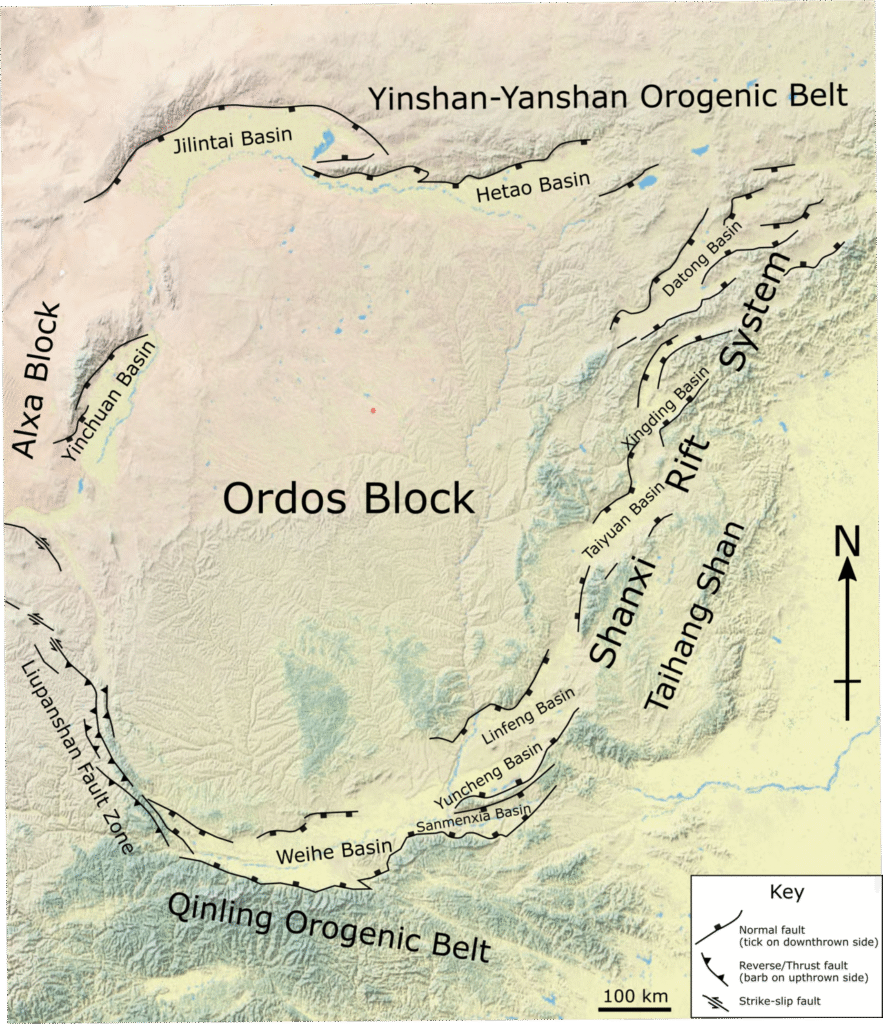 [[File:Ordos Block.png|thumb|Map of the Ordos Block showing the [[active fault|active]] [[fault (geology)|fault systems]] that form its boundaries]]