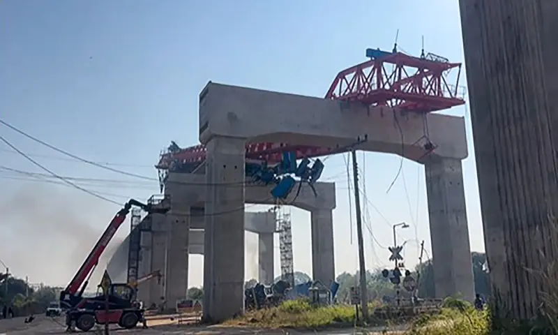 Footage from the scene verified by AFP showed the crane’s broken structure resting on giant concrete pillars, with smoke rising from the wreckage of the train below.