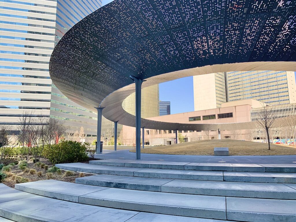 Pacific Plaza Park is a 3.7-acre (1.5Â ha) public park located in downtown Dallas, Texas, United States. The park is located between St. Paul Street and Harwood Street, north of Pacific Avenue in the City Center District, and opened to the public Oct. 14, 2019. The City of Dallas acquired the land with help from the Trust for Public Land.