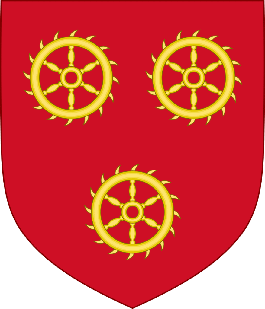Paon/Payne de Roet is often assumed to have been a descendant of a collateral branch of the Lords of Roeulx, of Hainault.[5] The traditional argument has been that Paon de Roet bore arms that were similar to those borne by the Hainault Lords of Roeulx, recorded by Rietstap as gu., a trios roués d’arg (while those of the modern town of Le Roeulx are a lion passant holding a single silver wheel [granted in 1822]).[6] The heraldic usage of a wheel for Roet is an example of a canting or punning coat of arms in which the heraldic device is a play on the name of the individual bearing the device; in this case, a single silver wheel for Roet/Roeulx/Ruet/Roelt, from rota, the Latin word for “wheel”. However, a problem with this argument of tying the family of Paon de Roet to a substantial Hainault patrimony is the finding of the Roeulx’ of Hainault bearing not wheels for Roet but instead the comital lions of Hainault (d’or, à trois lions de gueules), for the family from whom they descended. Thus while Paon himself may well have borne a coat of arms consisting of one or three silver wheels on a field of gules, it remains uncertain whether this was done to distinguish his family as a collateral branch from the Lords of Roeulx or, perhaps more likely, to simply match with the family name and denote that he was from the same general area, where wheels were often featured on the heraldic flags.[5]