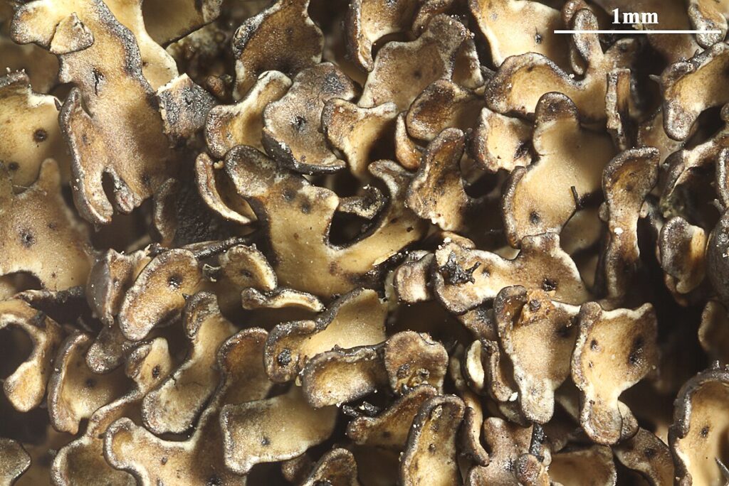 Parmelia pinnatifida was originally described as Parmelia omphalodes var. panniformis by Erik Acharius in 1803.[2] However, its unique characteristics led Syo Kurokawa, in 1976, to recognise it as a distinct species. Kurokawa’s reclassification was based on detailed studies of the lichen’s morphology and chemistry, which revealed differences from closely related taxa such as P. omphalodes and P. discordans. The specific epithet pinnatifida highlights the species’ hallmark repeatedly branched lobes, which form narrow, overlapping lobules.[3]