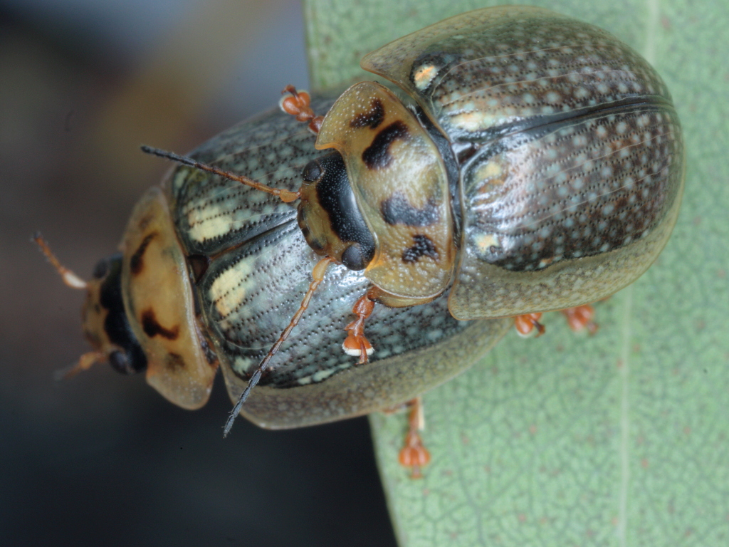 Paropsisterna agricola, or southern eucalyptus leaf beetle, is a small hemispherical leaf beetle. They can vary from golden to grey. They have some black markings on the pronotum. The epipleura (skirt) is sometimes red.