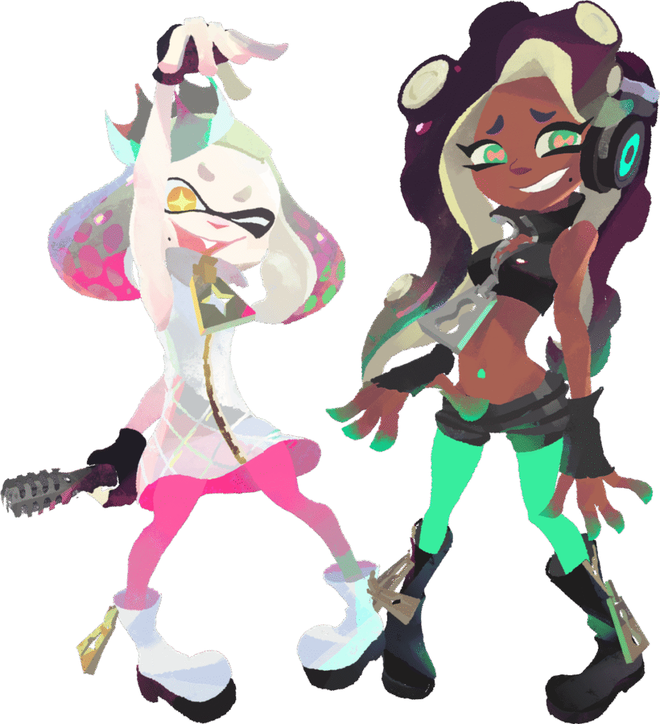 Pearl Houzuki (Japanese: ホウズキ・ヒメ, Hepburn: Hōzuki Hime) and Marina Ida (Japanese: イイダ=マリネ, Hepburn: Īda Marine) are a duo of characters from the Splatoon video game series. They were first introduced in Splatoon 2 (2017) as members of a pop music act known as Off the Hook (Japanese: テンタクルズ, Hepburn: Tentakuruzu; lit. “Tentacles”),[3]