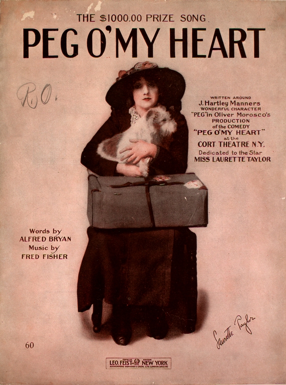 The song was inspired by the main character in the very successful Broadway play of the time, Peg o’ My Heart, that debuted December 20, 1912 at the Cort Theatre in NYC. The play was written by J. Hartley Manners and starred Laurette Taylor in the title role.[1] Taylor appeared on the cover of early published sheet music.[2]