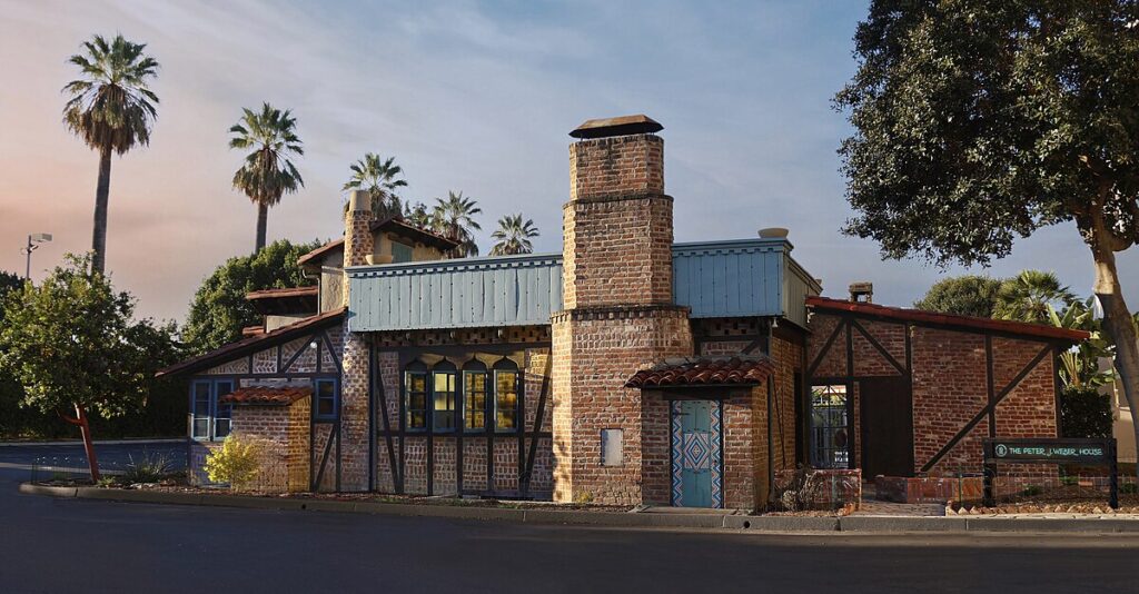 The Peter J. Weber House (also known simply as “The Weber House”) is a historic house and landmark in Riverside, California.[1][2] The house was designed and built by architect Peter J. Weber in the 1930s as a family residence and an expression of his creative work. The house is notable for its eclectic Depression-era design inspired by Medieval Spanish brick and half-timbering structures (with additional elements of Moorish and broadly Mediterranean influences) and its reliance on salvaged materials.[3]