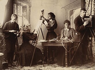 Women and young girls often worked behind the scenes in 19th century photographic studios, engaging in the creative and technical work of finishing photographs: retouching, hand-colouring, and mounting images.[11] Many also owned and operated their own studios, providing easier and more comfortable portraiture settings for female subjects in a Victorian era.