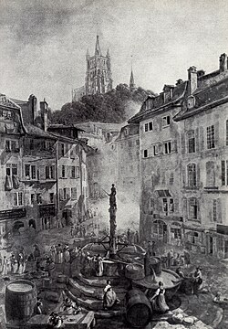 [[file:Lausanne Place de la Palud 1800.jpg|thumb|left|Place de la Palud in 1800, with the Fountain of Justice at its center, by [[Abraham-Louis-Rodolphe Ducros]].]]