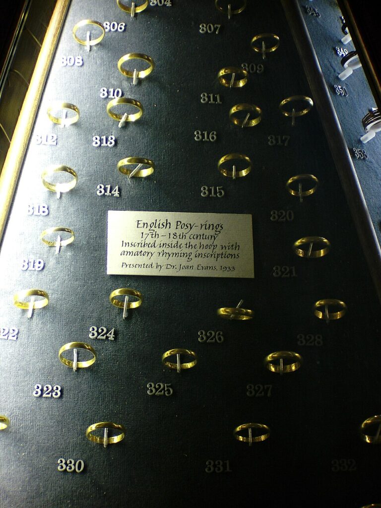 The Ashmolean Museum in Oxford, England, has an vast collection. The Victoria and Albert Museum in London also has a decently sized collection bequeathed by Joan Evans. She compiled a list of more than 3000 posies for her book English Posies and Posy Rings.