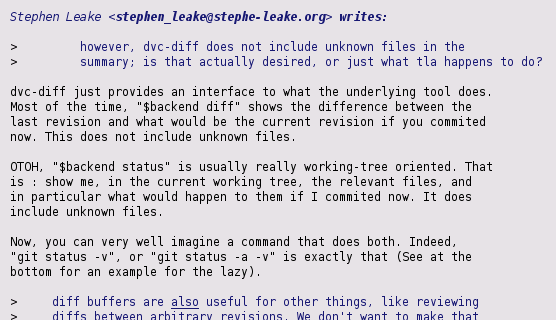Sometimes the insertion of a quoted line marker will cause one original line to be folded as two lines in the reply, and the continuation line may not have the proper marker. To avoid ambiguity in such cases, one may consider inserting blank lines after each block of quoted text: