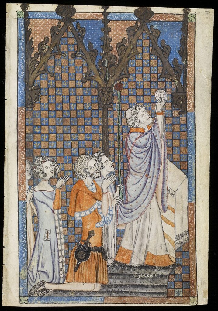 For the lay congregation, however, the mass was a series of collective devotions and ritual actions; the most important elements would be the Gospel, prône (“bidding prayers”, see below), offertory procession, and distribution of the pain bénit at the end of the mass.[…]The laity’s mass was less sacrifice and sacrament than a communal rite of greeting, sharing, giving, receiving and making peace.”[35]: 532 [note 10]