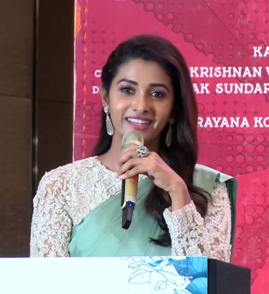 Priya is from a Tamil speaking family. First she gained recognition as a television news presenter at the Tamil news channel Puthiya Thalaimurai.[6] She also worked as a serial actress in Star Vijay Television‘s Kalyanam Mudhal Kadhal Varai.[3] In 2017, she made her film debut with Meyaadha Maan opposite Vaibhav, for which she was nominated for a SIIMA Award for Best Female Debutant.[7]
