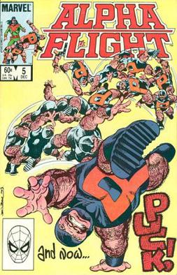 Puck debuted in Alpha Flight #1 (Aug 1983) and was created by John Byrne.[1] He had intended for the original Puck to be a dwarf with no superhuman powers, merely great fighting and acrobatic skills; subsequent writer Bill Mantlo retconned Puck’s small stature as being due to mystical influences. Byrne commented on this, “Of course, [Bill Mantlo] then went on to do the ‘origin’ of Puck, with the whole ‘demon inside’ thing being based, apparently, on the single reference Puck had made to being in constant pain, something which Bill failed to grasp was an effect of the condition — achondroplasty, called by name in the same issue that referenced the pain — which caused Puck’s dwarfism.”[2] Byrne has also stated that Puck was based “very, very loosely on a friend who was short (but not as short as Puck) and occasionally bald, but never possessed by demons.”[3]