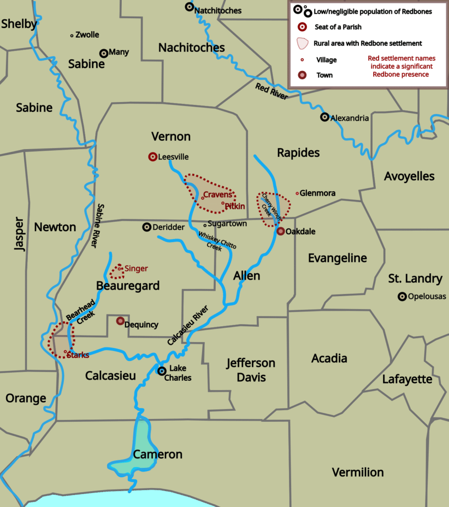 The Louisiana Redbones historically lived in geographically and socially isolated communities in the southwestern Louisiana parishes, ranging from Sabine Parish in the northwest and Rapides Parish near the center of the state down to Calcasieu Parish in the southwest,[9] including parts of Orange County, Texas and Newton County, Texas. This area is roughly coextensive with what was once known as the Neutral Ground or Sabine Free State, an area of disputed sovereignty from 1806 to 1821 that was primarily bound on the east by the Calcasieu River and the Sabine River on the west.[10] Academically, the group has been termed “under-researched.”[9]