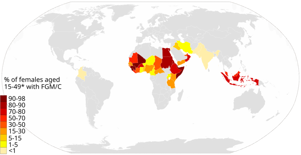 Islam introduced FGM into Indonesia and Malaysia from the 13th century on.[77][78] Over 80 percent of Malaysian women claim religious obligation as the primary reason for practising FGM, along with hygiene (41 percent) and cultural practice (32 percent).[79] The practice is widespread among Muslim women in Indonesia.[80] In 2013 the Indonesian Ulema Council, Indonesia’s top Muslim clerical body, ruled that it favours FGM, stating that although it is not mandatory, it is “morally recommended”.[81] The Ulema has been pushing the Indonesian government to circumcise girls, arguing that it is part of Islamic teachings.[82] In 2014, Indonesia criminalized all forms of FGM after it repealed exceptions to the laws.[83]