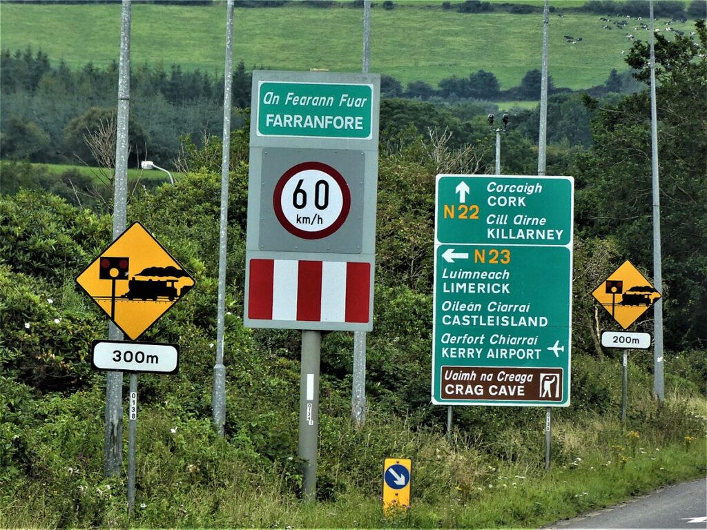 The system of directional signs is based upon, and is very similar to, that employed in the United Kingdom, but is bilingual everywhere except in the Gaeltacht, where only the Irish language is used on signs.
