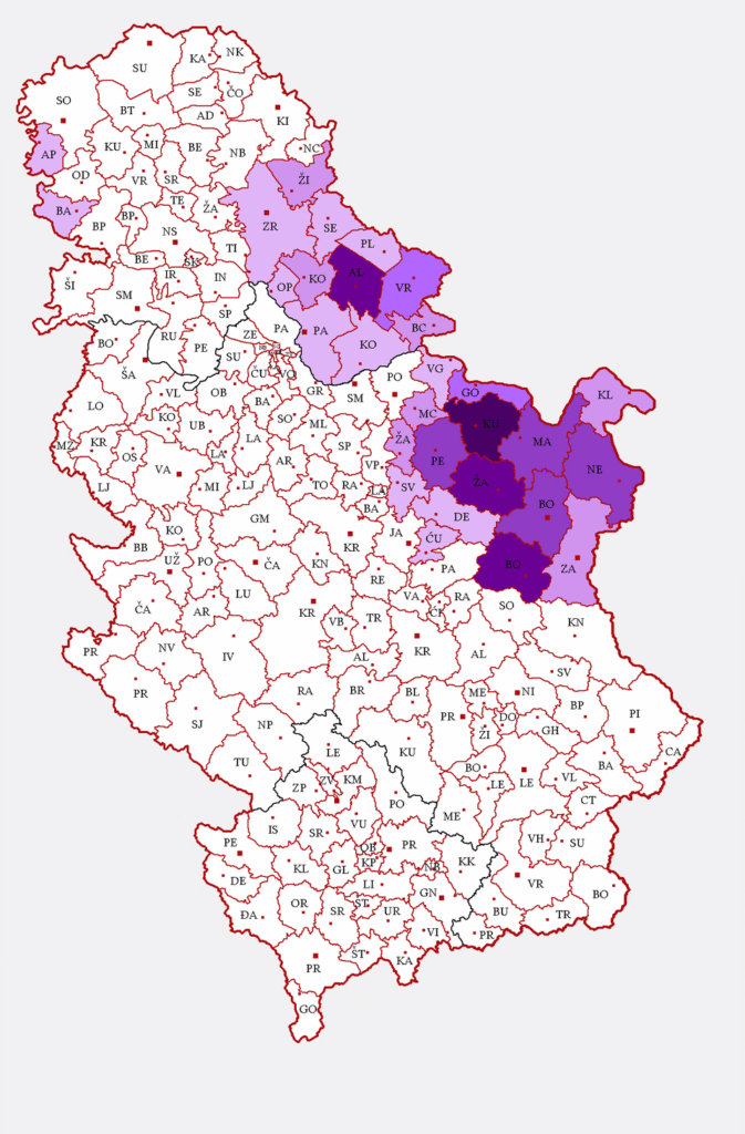 The Romanian language is spoken as a mother tongue by 0.3% of the total population of Serbia with additional 0.3% declaring their mother tongue as “Vlach”. According to data from the 2022 census, there are total of 60 thousand people declaring their ethnicity as either Romanians (mainly in Banat) and the Romanians[1]/Vlachs (mainly in Timok Valley). The former speak the Banat Romanian, identify as ethnic Romanians with Romanian being one of the six languages of provincial administration of Vojvodina. Romanian/Vlachs in Timok Valley speak archaic varieties of the Banat and Oltenian Romanian. Most of the members of community do not identify as ethnic Romanians[2] and their language is not officially recognized as Romanian by the Serbian state but as “Vlach language” which undergone attempted standardization, using a Cyrillic alphabet. This has been criticized in Romania, and attempts to bring Romanian-language resources and education to the Timok Vlachs have been blocked by the Serbian authorities.