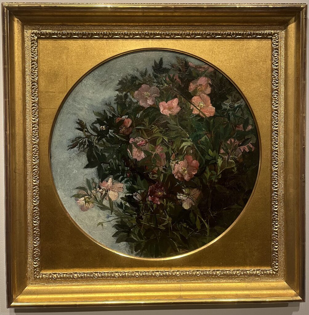 Rose Garden portrays a wild rosebush, painted in oil on a circular panel, with the dimensions 56.2 x 55.2 cm (22 1/2 x 21 3/4 in.).[1] The painting was completed in 1882, and is done in impressionist style. It was likely created plein air in Dewing’s own garden, as she was an avid botanist, and many of her works were done outdoors.[2]