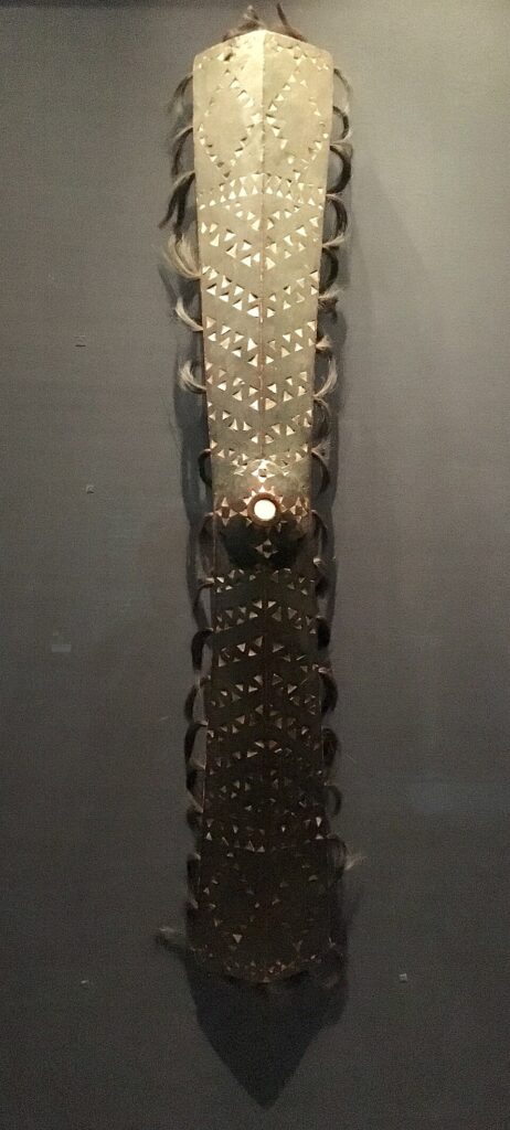 The Salawaku is a long hour-glass shaped shield. The shield, including the handle, is carved from a single piece of wood. The upper and lower part are broad, and the shield is thinnest in the middle. At the front, it is rounded or has a slight V-shape so that the centre part comes to the foreground. The shield is slightly curved from top to bottom. On the rear, an elevated rib can be seen along the entire length, part of which is the handle in the middle. The front of the Salawaku is painted black using soot and plant juice. It is inlaid with mother-of-pearl and fragments of earthenware, and/or painted with kakean symbols (used by a secret society) and other ornaments; these materials often hint at the foreign aspect of the shields. The shield forms a ‘body’, and the inlaid patterns refer to certain bodily parts. The upper segment refers to the head, and the lower part to the feet. Arteries run lengthwise. The elevated rib on the rear side represents the spine and, just below the handle, the larynx. Inlays just above the centre represents the eyes. Their number allegedly refers to the number of enemies killed by the ancestors. The shield must be shorter than two arms’ length, in order to avoid the shield’s end, and held against the chin to avoid tears falling on the shield, as ‘courage and sadness must be separated.’[3]