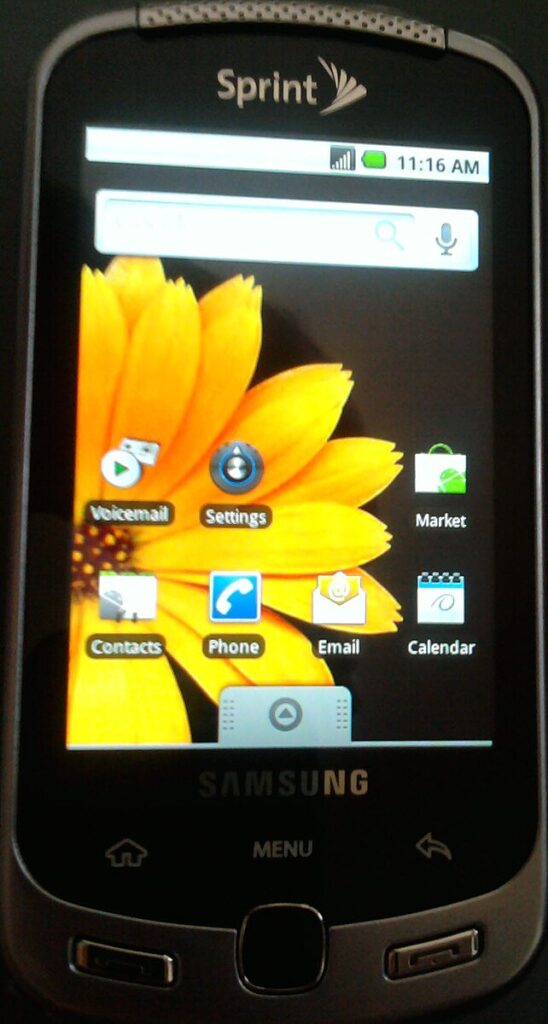 The base of the Moment’s Android 1.5 interface is identical to the unmodified Android install in T-Mobile’s G1 phone; built-in software includes Mobile Google services such as Google Search, Gmail, YouTube, Google Calendar, and Google Talk. Building from that, Samsung added Moxier Mail (POP/IMAP Support, Microsoft Exchange access) and Nuance VoiceControl, while Sprint installed NFL Mobile, NASCAR Sprint Cup, Sprint Navigation, and Sprint TV.
