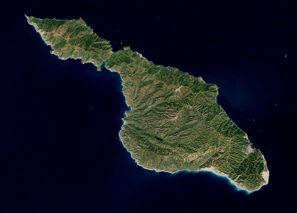 The island is rich in quartz, to the extent that some beaches on the seaward side have silvery-grey sand.[27] These deposits provide insights into the island’s history, as they contain fossils of ancient marine life. The island is situated along the boundary of two tectonic plates: the Pacific Plate and the North American Plate. This boundary is marked by the San Andreas Fault and the East Pacific Rise. The islands in this region have been shaped by tectonic uplift and volcanic activity. This means that the Santa Catalina Island land-mass was never directly connected to mainland California. Other geologic factors that contributed to the island topography include further geologic uplift and subsidence, tectonic plate movement, sedimentation, metamorphic activity, weathering, and erosion. The island’s landscape is characterized by rugged terrain, including steep cliffs, canyons, and rolling hills. There are also geologic features such as sea caves and marine terraces along the coastline.[4]