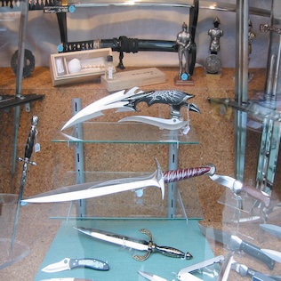 The album’s artwork is a photo of a store display with various knives, daggers and katanas for sale. Liner notes are written over the image with a clear varnish, which only allows the text to be read when shone under a light.