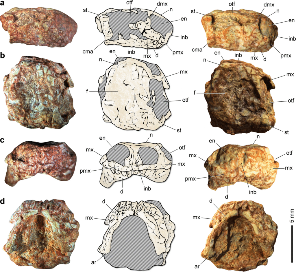 Like many fossils from the Dinodontosaurus AZ, much of the specimen is covered in mineral concretions, with the external bone surface poorly preserved. As such, much of the anatomy and details of CAPPA/UFSM 0510 are obscured. This is exacerbated by the specimen’s tiny size. When seen from above, the snout of the specimen is broad and rounded. This region comprises a comparatively short and deep part of the skull. These proportions are more similar to some procolophonids than owenettids (the two major lineages of Procolophonoidea), as the latter are characterized by a longer, flatter snout. The external nares (‘nostril hole‘ in the skull) are especially wide and tall. When seen from the side, the external naris is elongated, similar to owenettids and basal procolophonoids. The orbitotemporal fenestra (‘eye hole‘ in the skull) is similarly elongate, with the rear margin almost reaching the posterior part of the skull. In owenettids, this fenestra is anteroposteriorly shorter (shorter from front to back). There are three tooth positions in the premaxilla, similar to some procolophonids and in contrast to owenettids, which have at least five. These teeth in Sauropia are straight, cylindrical in cross-section, and lacking cusps. The front tip of the premaxilla projects downward. The maxilla is incomplete, missing the rear portion. The number of maxillary teeth is unclear, as only one tooth is preserved in the right maxilla. The bones of the skull roof are poorly preserved and difficult to distinguish, but it likely had particularly wide frontals, a distinctive feature not seen in other procolophonoids (possibly due to the individual’s young age). The mandible is generally horseshoe-shaped. Its dentition is not visible.[1]