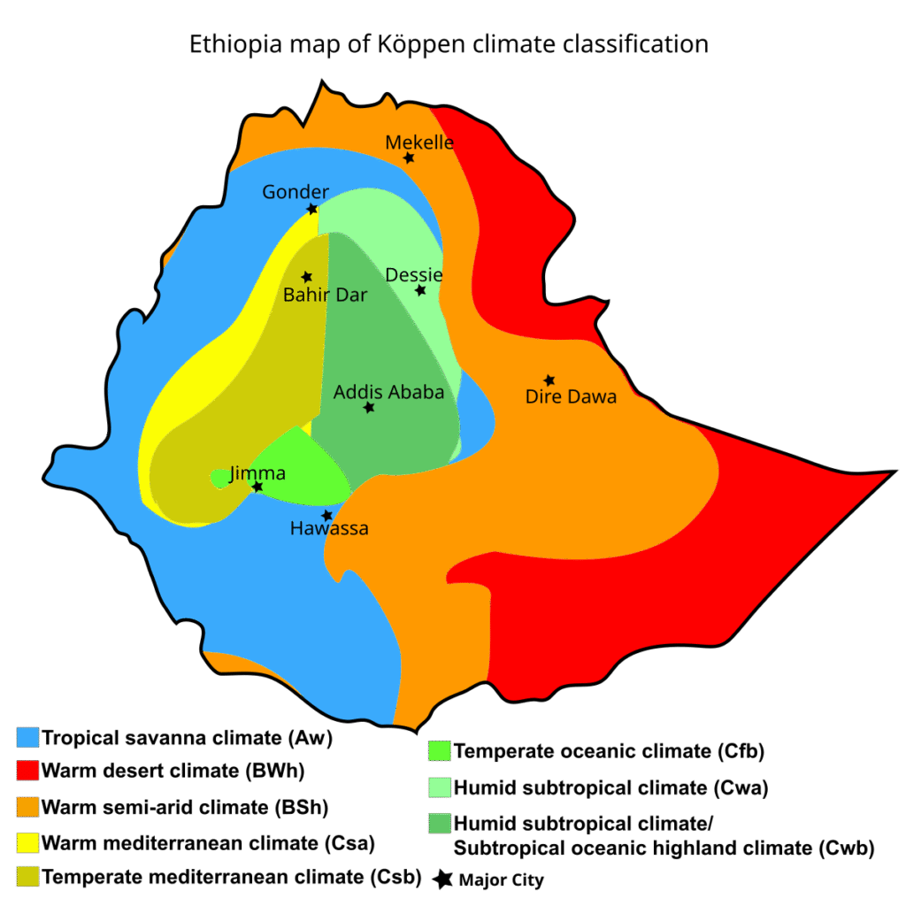 [[File:Ethiopia map of Köppen climate classification.svg|thumb|Köppen climate classification of climate of [[Ethiopia]]]] |