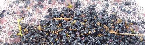 [[File:Mthomebrew maceration.JPG|right|thumb|400px|In red wine production, the [[maceration (wine)|maceration]] process was traditionally done in large vats where the [[fermentation (wine)|fermentation]] process would begin ”(in the picture this is noted by the presence of carbon dioxide bubbles)”. Secondary fermentation would take place when the wine is transferred to a second container such as a carboy or oak barrel.]] |